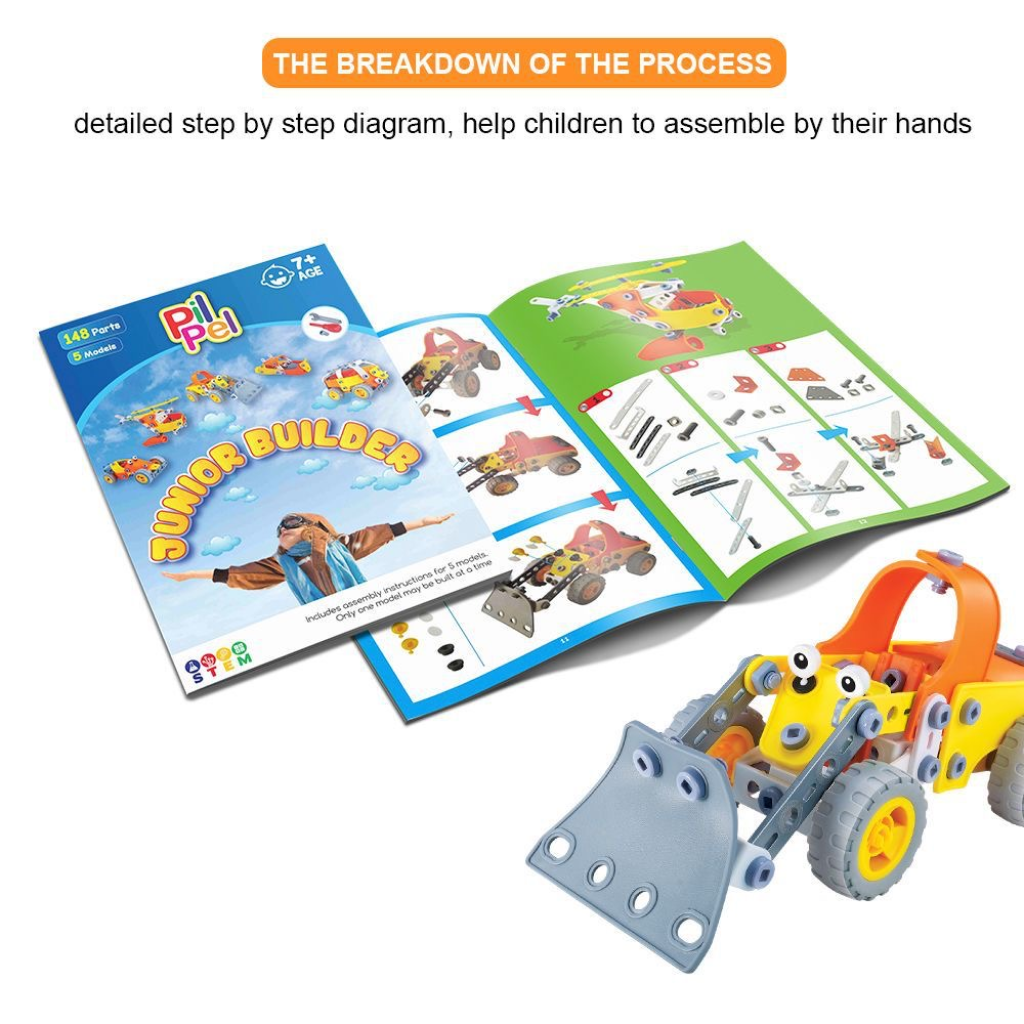 The packaging showcases playful illustrations of buildable models, sparking curiosity and creativity before the box is even opened. Inside, children will find an assortment of easy-to-handle parts that promote: