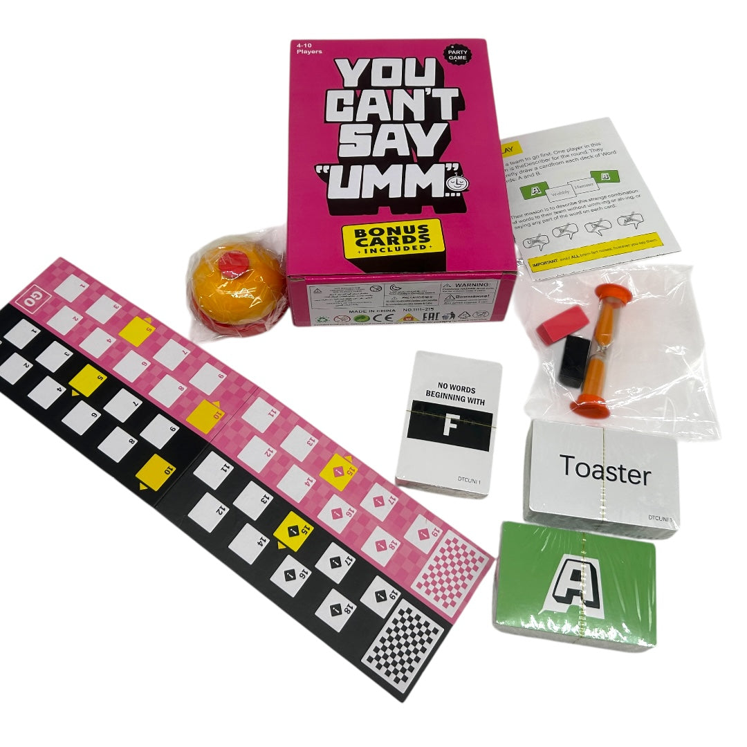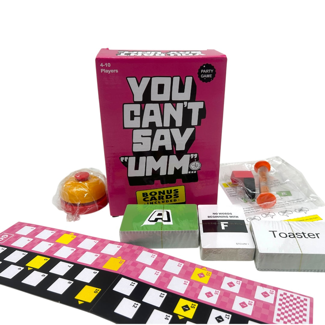 "You Can't Say 'Umm'" is a fast-paced, laugh-out-loud party game designed to challenge your quick thinking and verbal dexterity. Perfect for groups of 4 to 10 players, the goal is simple—but deceptively tricky: talk your way through prompts without saying the forbidden word—"umm."